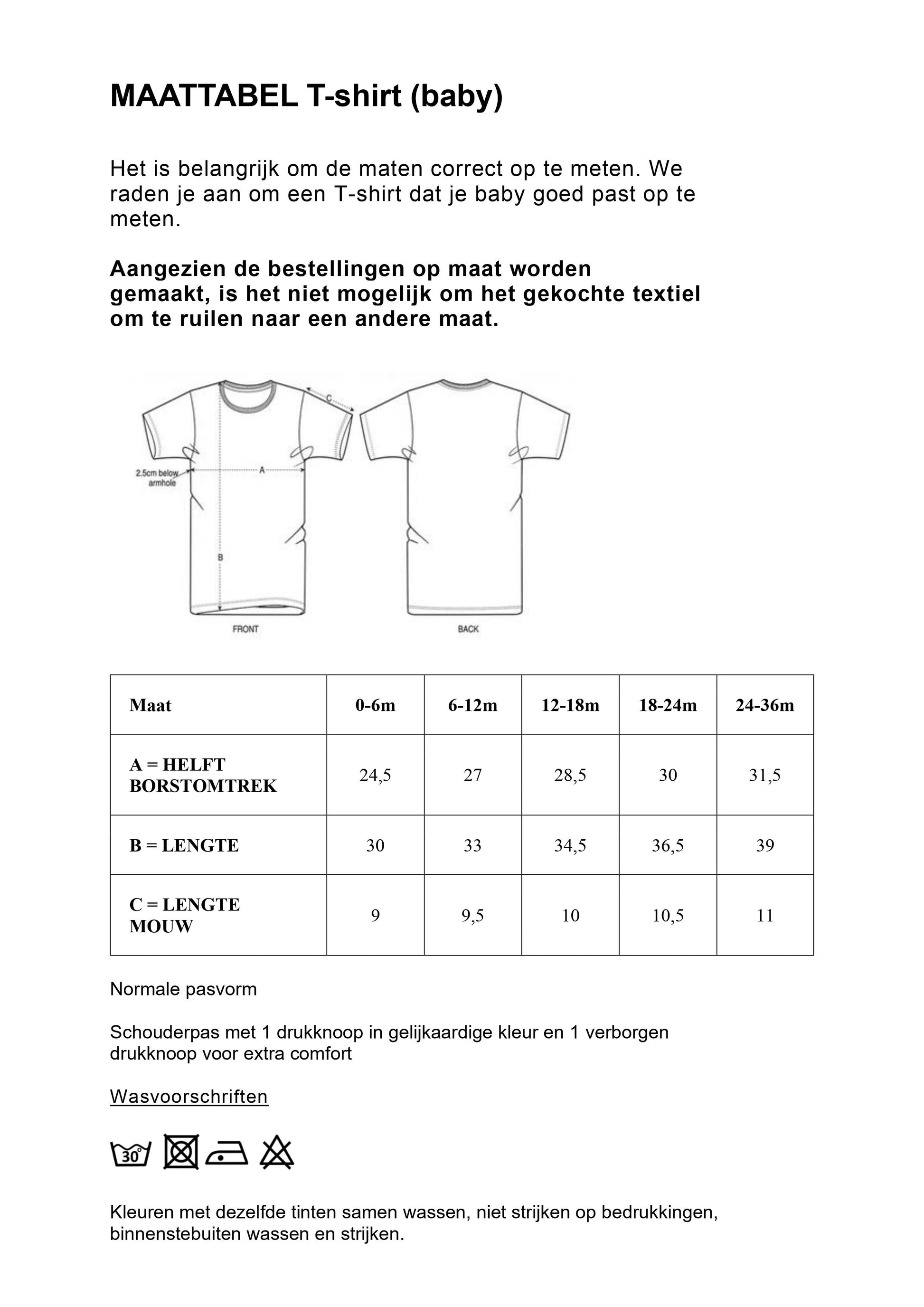 Het is belangrijk om de maten correct op te meten. We raden je aan om een T-shirt dat je kind goed past op te meten en te vergelijken met de maattabel. Aangezien de bestellingen op maat worden gemaakt, is het niet mogelijk om het gekochte textiel om te ruilen naar een andere maat.