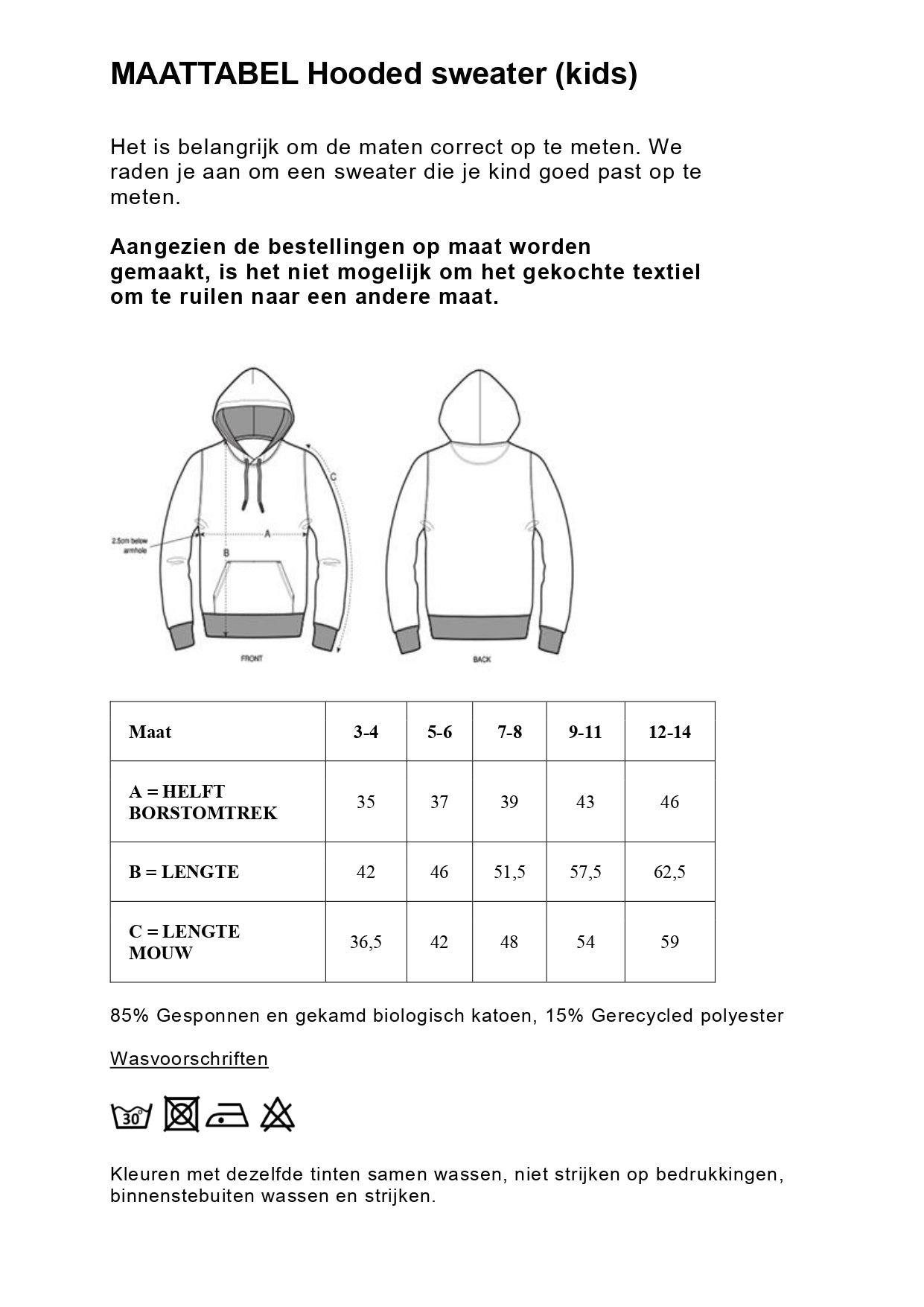 Het is belangrijk om de maten correct op te meten. We raden je aan om een sweater die je kind goed past op te meten en te vergelijken met de maattabel. Aangezien de bestellingen op maat worden gemaakt, is het niet mogelijk om het gekochte textiel om te ruilen naar een andere maat.