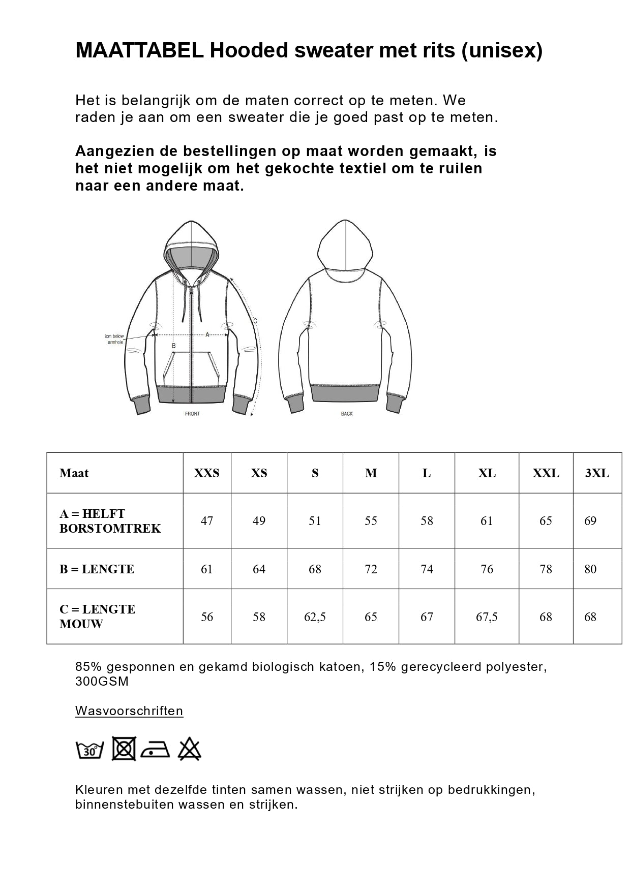 Het is belangrijk om de maten correct op te meten. We raden je aan om een sweater die je goed past op te meten en te vergelijken met de maattabel. Aangezien de bestellingen op maat worden gemaakt, is het niet mogelijk om het gekochte textiel om te ruilen naar een andere maat.