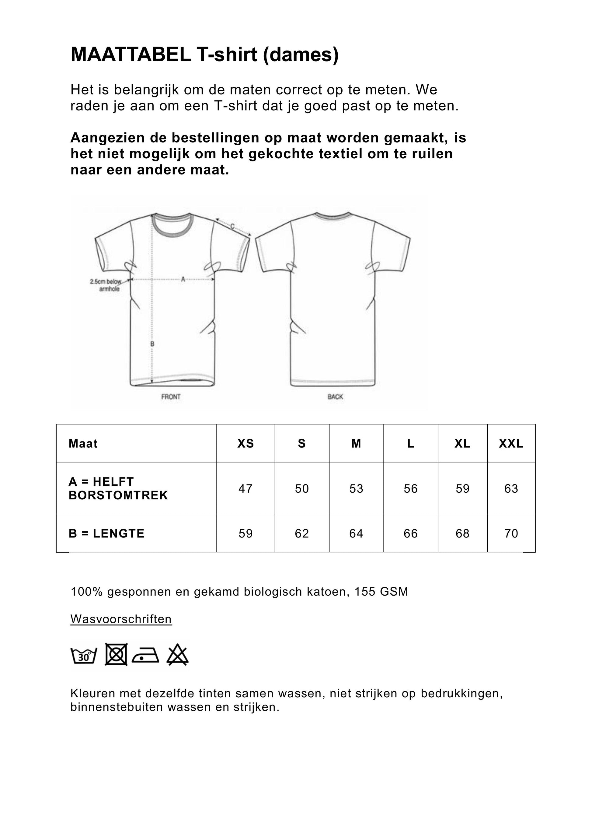 Het is belangrijk om de maten correct op te meten. We raden je aan om een T-shirt dat je goed past op te meten en te vergelijken met de maattabel. Aangezien de bestellingen op maat worden gemaakt, is het niet mogelijk om het gekochte textiel om te ruilen naar een andere maat.