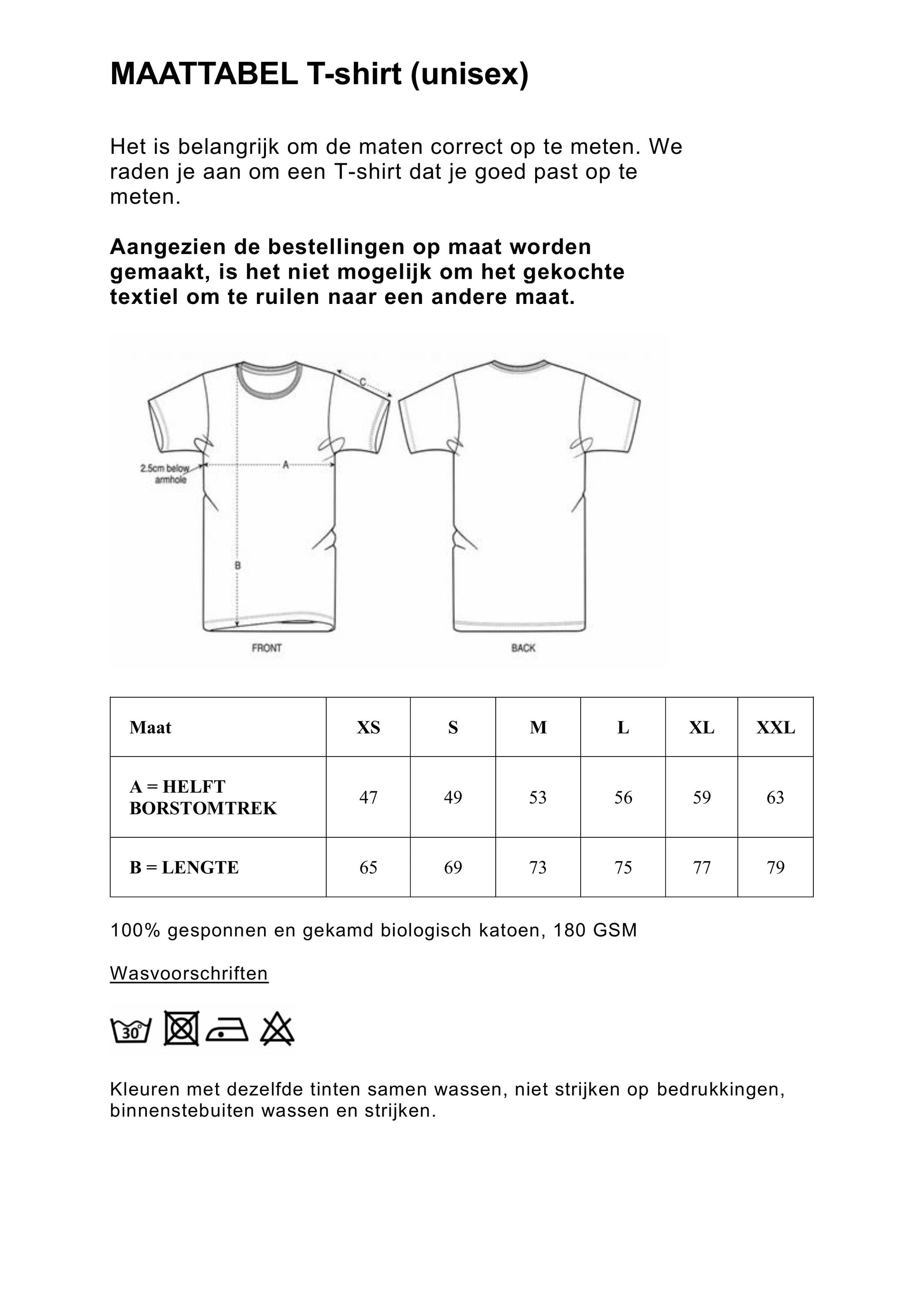 Het is belangrijk om de maten correct op te meten. We raden je aan om een T-shirt dat je goed past op te meten en te vergelijken met de maattabel. Aangezien de bestellingen op maat worden gemaakt, is het niet mogelijk om het gekochte textiel om te ruilen naar een andere maat.