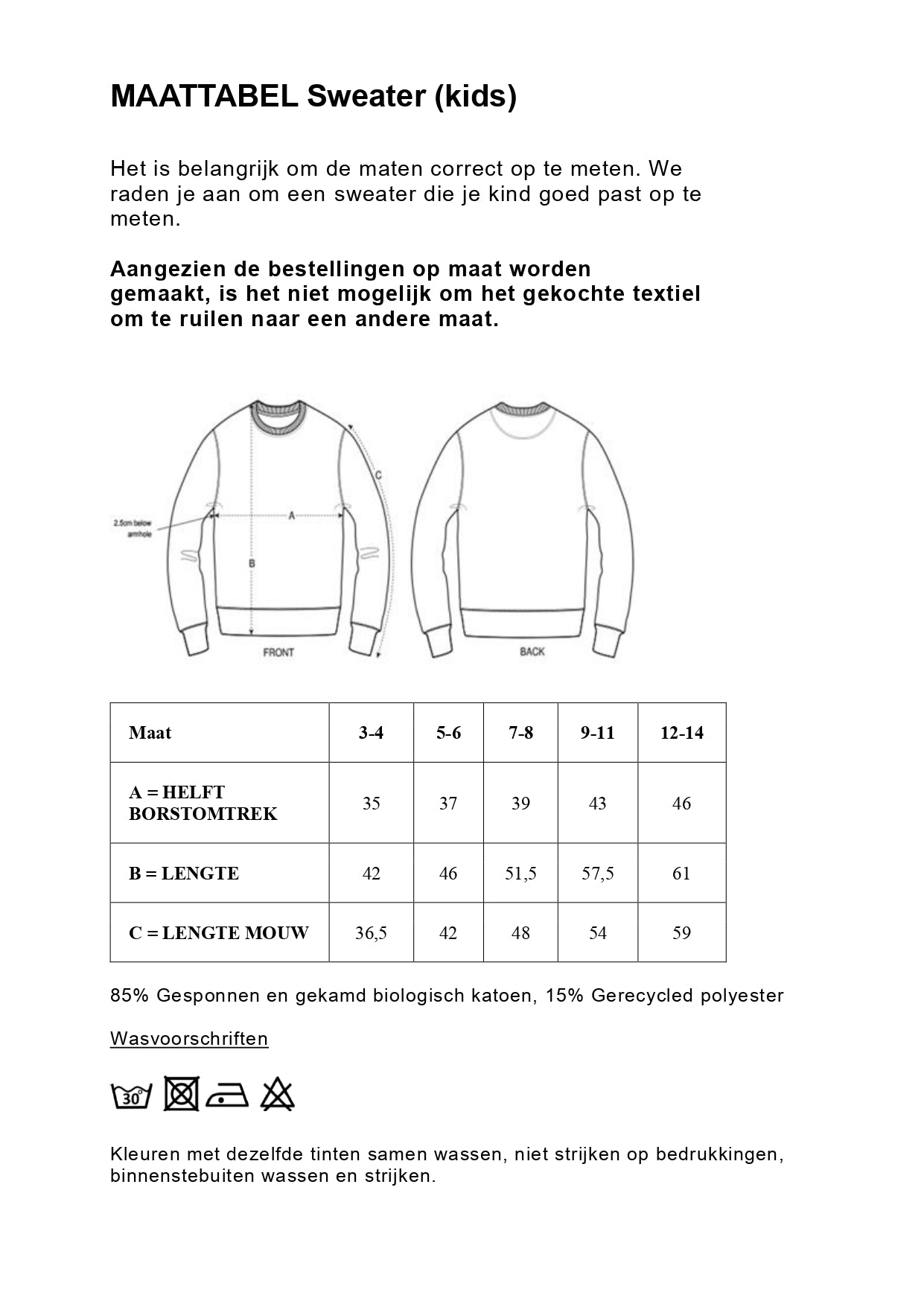 Het is belangrijk om de maten correct op te meten. We raden je aan om een sweater die je goed past op te meten en te vergelijken met de maattabel. Aangezien de bestellingen op maat worden gemaakt, is het niet mogelijk om het gekochte textiel om te ruilen naar een andere maat.