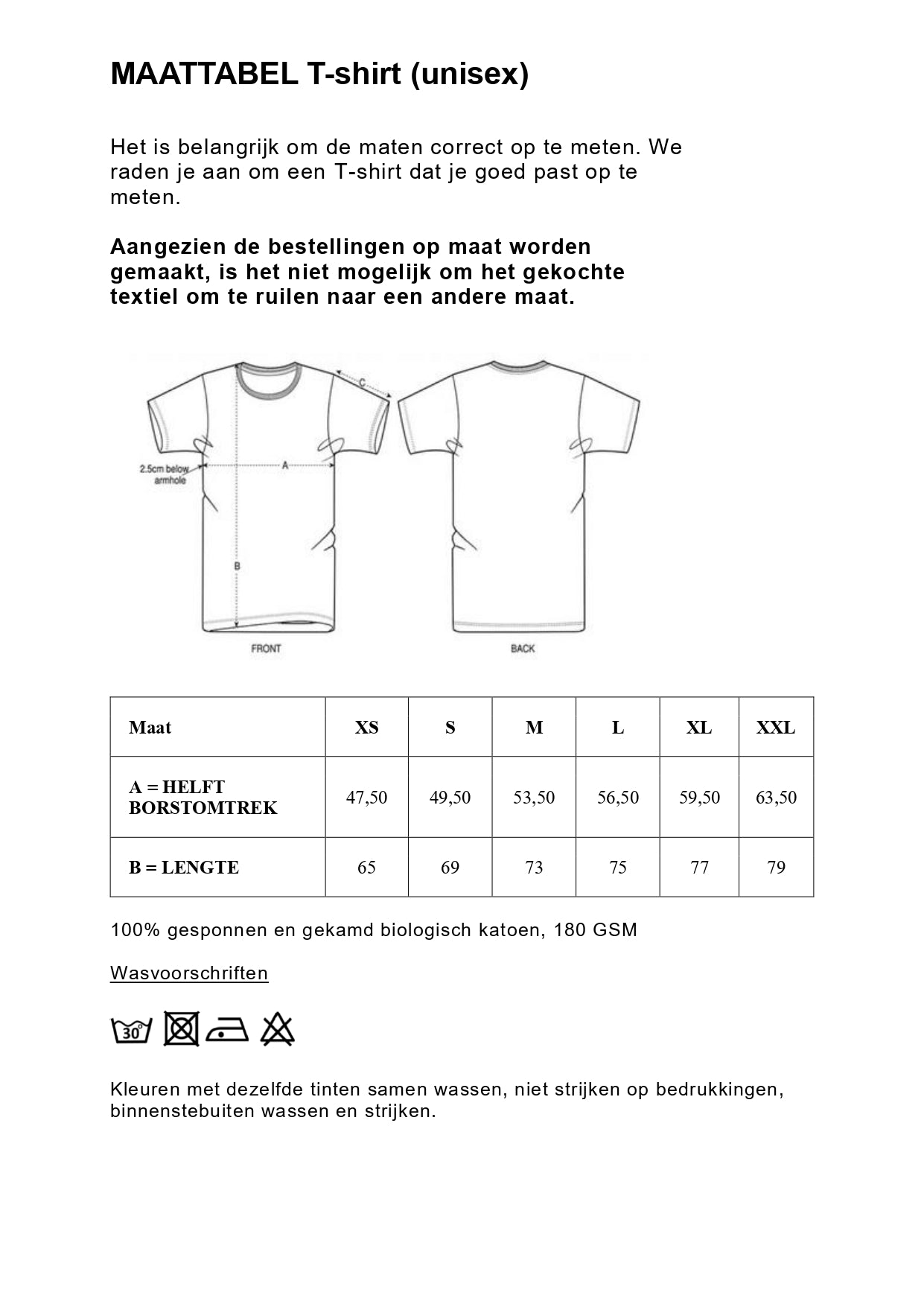 Het is belangrijk om de maten correct op te meten. We raden je aan om een T-shirt dat je goed past op te meten en te vergelijken met de maattabel. Aangezien de bestellingen op maat worden gemaakt, is het niet mogelijk om het gekochte textiel om te ruilen naar een andere maat.